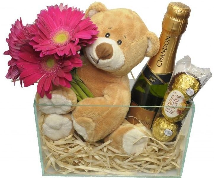 Arranjo elaborado com um lindo urso de pelúcia aproximadamente 20 cm, nele um delicado arranjo de gerberas em cores da época para ainda ficar mais elegante o arranjo acompanha uma garrafa de chandon baby e um chocolate ferrero rocher com 3 unidades.