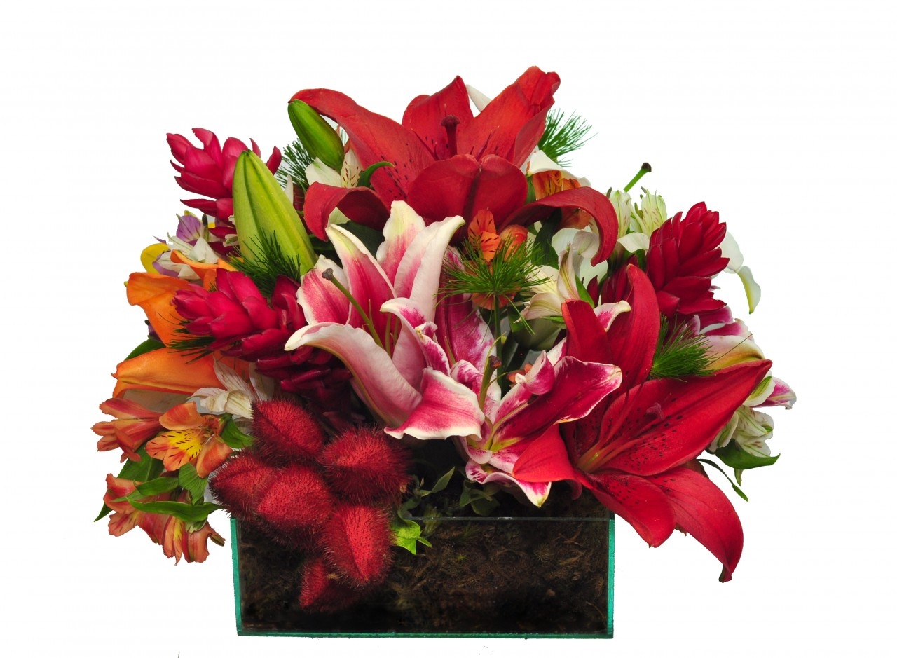 Arranjo de flores finas contendo lírios, alstromérias e gerberas
