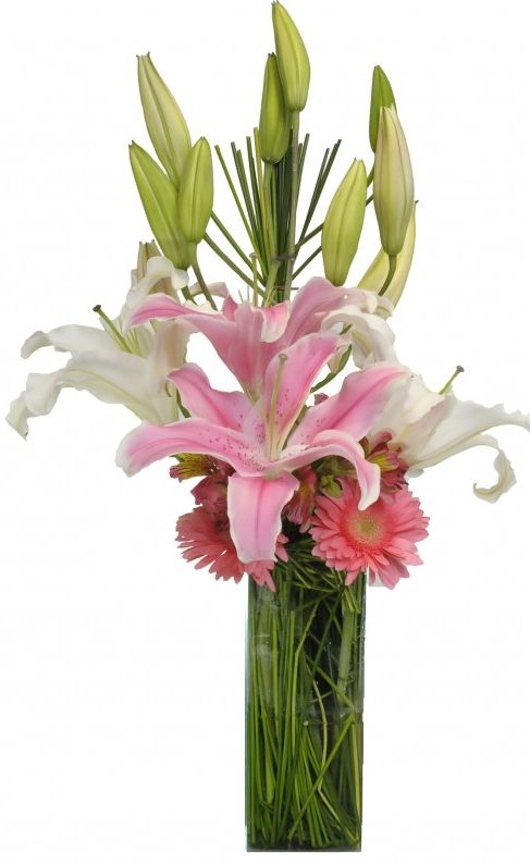 Lindo arranjo elaborado com lírios cor de rosa, lírios brancos, alstromérias,junco e gerberas em cores da época no vidro grande,
