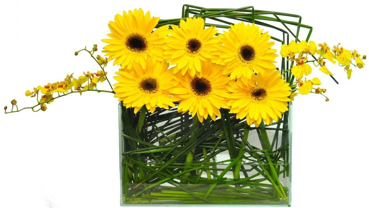 Arranjo artesanal estilo barreira feitos com gerberas cor amarela ou cores da época , acompanhado de uma linda camada de juncos confeccionado na tradicional peça de vidro,opção de ser embalado para presente acompanha um lindo laço de cetim.