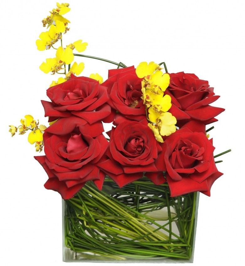 Lindo arranjo contendo 6 rosas vermelhas e junco com um toque especial de oncydium,