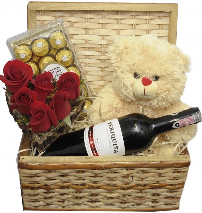 Lindo baú de vime contendo um arranjo com 6 rosas vermelhas, trabalhado em uma peça de madeira no formato de coração. para ficar ainda mais elegante o arranjo é acompanhado de uma pelúcia de 30Cm, uma Garrafa de vinho periquita de 750 ml e um Ferrero Rocher com 12 unidades.