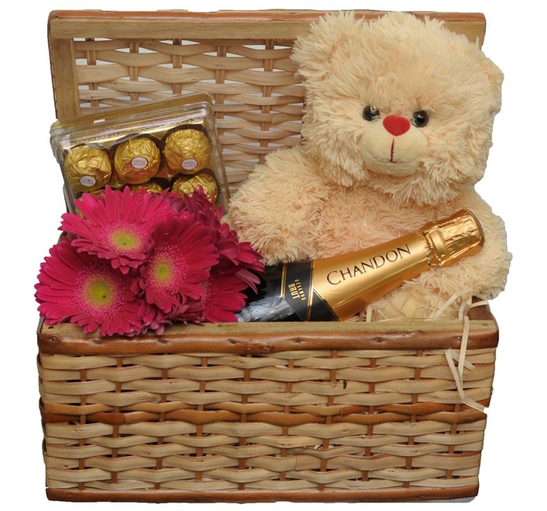 Baú de vime contendo um arranjo de gerberas cor de rosa ou elaborado em cores da época,para o presente ficar ainda mais elegante acompanha uma garrafa de chandon brut . uma caixa do delicioso bombom ferrero rocher com 12 unidades e uma pelúcia de aproximadamente 30 Cm.