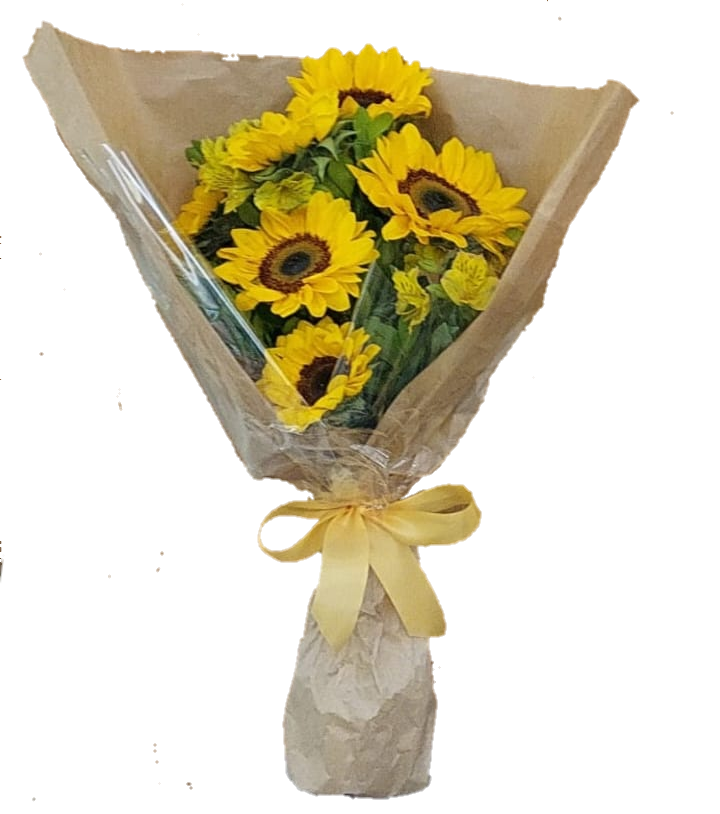 Lindo buque de Girassois, Contendo 6 Flores Folhagens e Trabalho em Papel Crafitt e Celofane Transparente, Muita Elegância e Sofisticado, Presente Ideal para aquela pessoa especial.