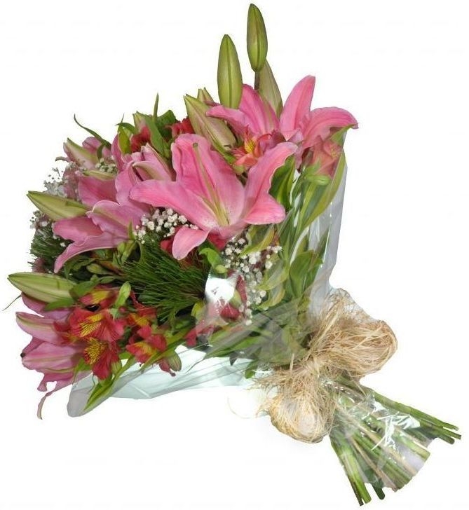Lindo buquê elaborado com aproximadamente 10 flores de lírios e 6 galhos de alstromérias e folhagens especiais ,
