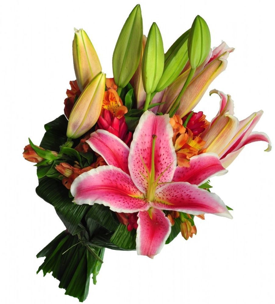 Lindo buquê elaborado com aproximadamente de 6 a 8 flores flores de lírios cor de rosa e envolta folhagem canoa,embalado para presente no tradicional celofane transparente acompanha lindo laço de cetim ou ráfia.