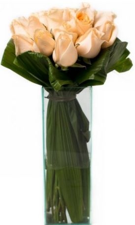 Buquê elaborado com 20 rosas champanhe especiais, com acabamento envolta de folhagem canoa,acompanha um lindo laço de cetim ou tecido especial.