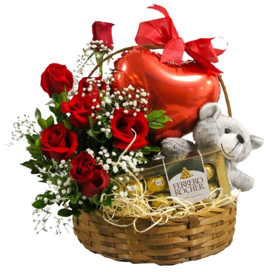Cesta Coração a Mil Contendo Arranjo com 6 Rosas Vermelhas, Pelúcia e Um Lindo Balão Metalico Em Formato de Coração na Cor Vermelha. Embalado Para