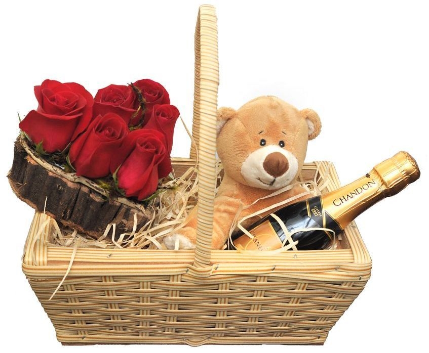 Linda cesta contendo um arranjo no formato de coração elaborado com 6 rosas vermelhas, acompanhado de uma garrafa de chandon e um ursinho de pelúcia,