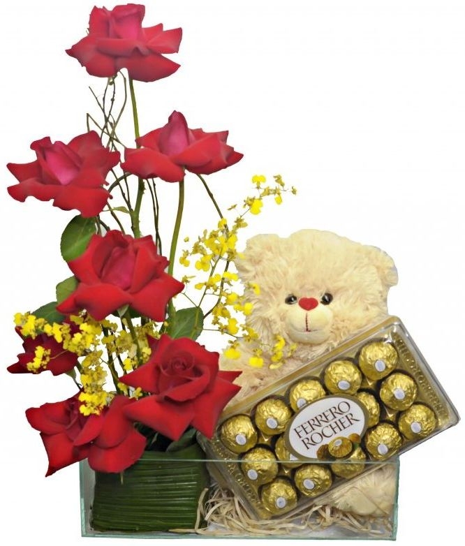 Lindo Arranjo Elaborado com rosas vermelhas,um toque todo especial de orquídeas oncydium ou tango, acompanha uma linda pelúcia de 30 cm,e uma caixa de bombom ferrero rocher com 12 unidades,