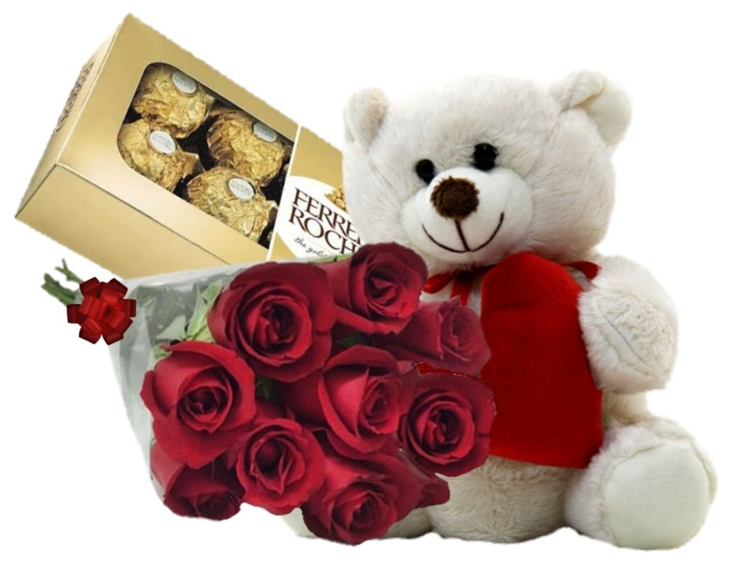 Kit Amore, Contendo 6 Rosas Vermelhas,1 Peluçia de 20Cm e 1 Caixa do delicioso Ferrero Rocher de 8 Unidades.