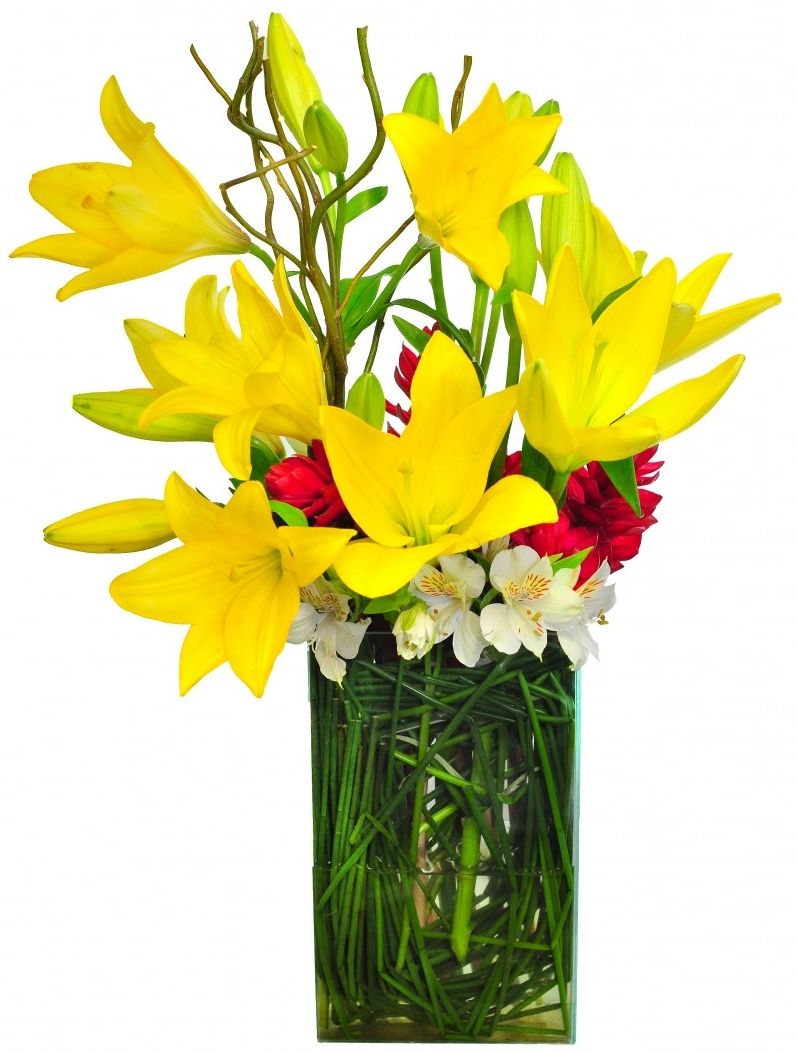 Arranjo de lirios amarelos,alpinias vermelhas,astromérias brancas ou coloridas e junco na peça de vidro,