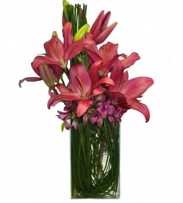 Arranjo de lirios rosa,astromérias,gerberas e junco na peça de vidro alto, acompanha um lindo laço de cetim combinando com as flores.