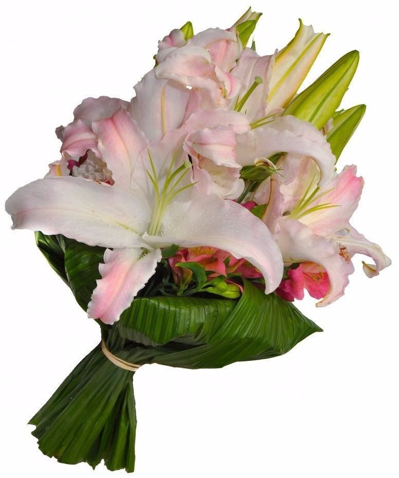 Lindo buquê trabalho com lírios brancos e um toque especial de alstromérias envolta folhagem canoa,embalado para presente no tradicional celofane transparente acompanha um lindo laço de cetim ou ráfia.