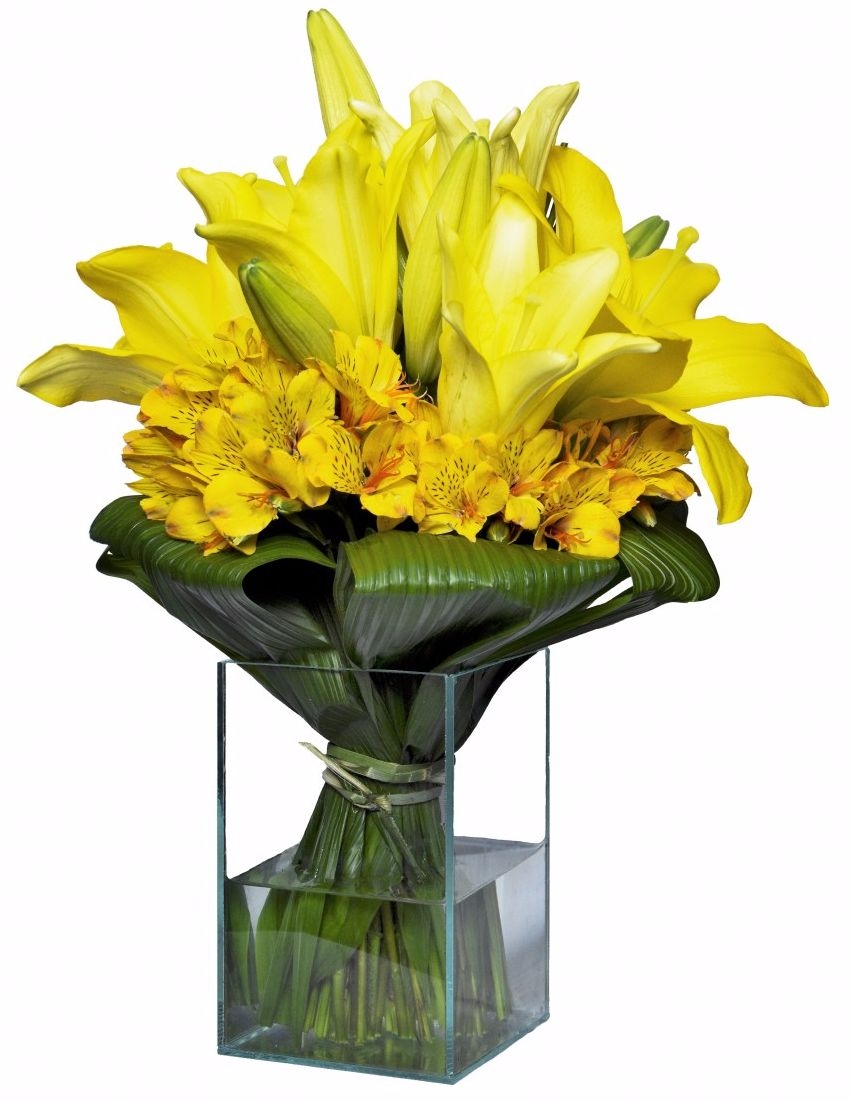Arranjo de lírios elaborado com lírios Amarelos e alstromérias envolta acabamento de folhagem canoa no vidro, acompanha um lindo laço de cetim ou tecido especial.
