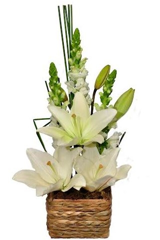Lindo arranjo de lírios brancos e boca de leão brancas com acabamento de junco e musgo trabalhado em uma peça de madeira rustica,