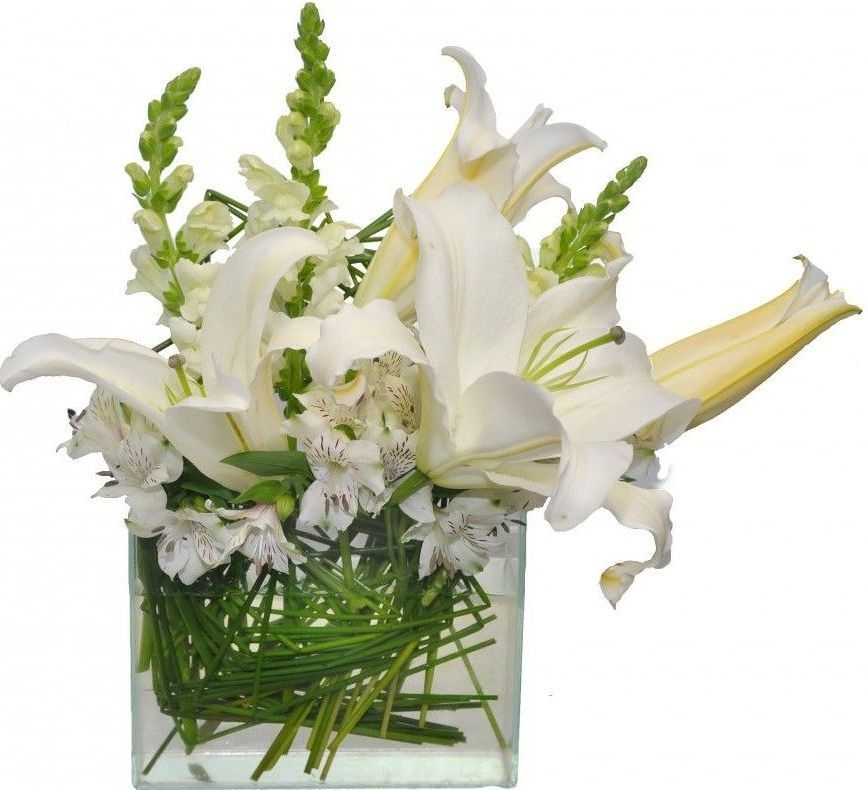 Arranjo elegante de lírios brancos,boca de leão e junco na peça de