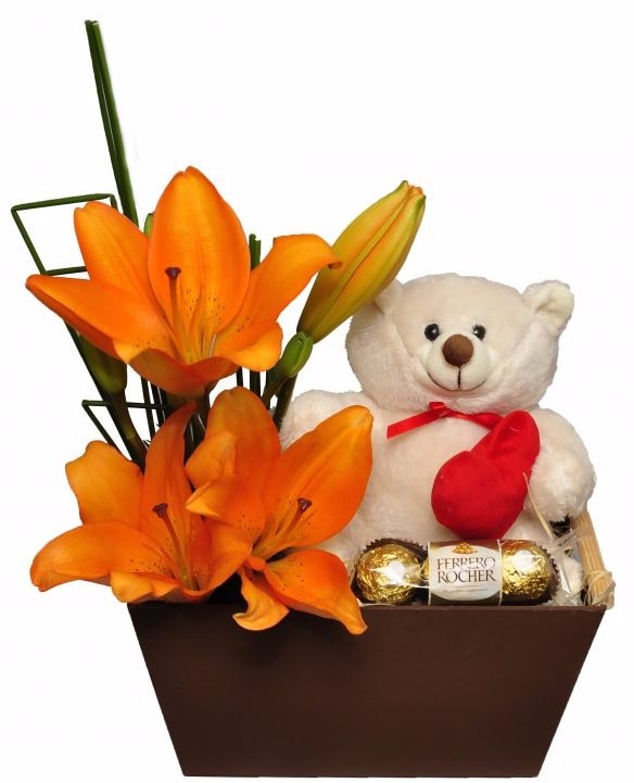 Lindo arranjo de lírios laranja e acabamento em folhagens especiais elaborada em Uma caixa de madeira trabalhada em Pvc ou madeira, Acompanhada de Uma Linda pelúcia e junto 3 unidades do delicioso chocolate Ferrero Rocher.