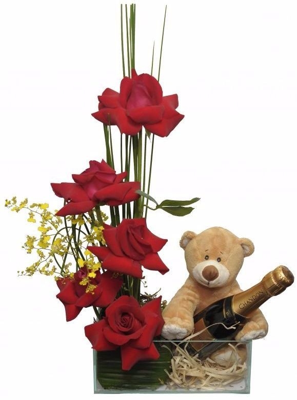 com 5 rosas vermelhas de exportação e um toque especial de orquídeas oncídyum ou tango, feito em uma jardineira de vidro e ainda acompanha um lindo urso de pelúcia e para completar o presente sera acompanhado de uma garrafa chandon baby.